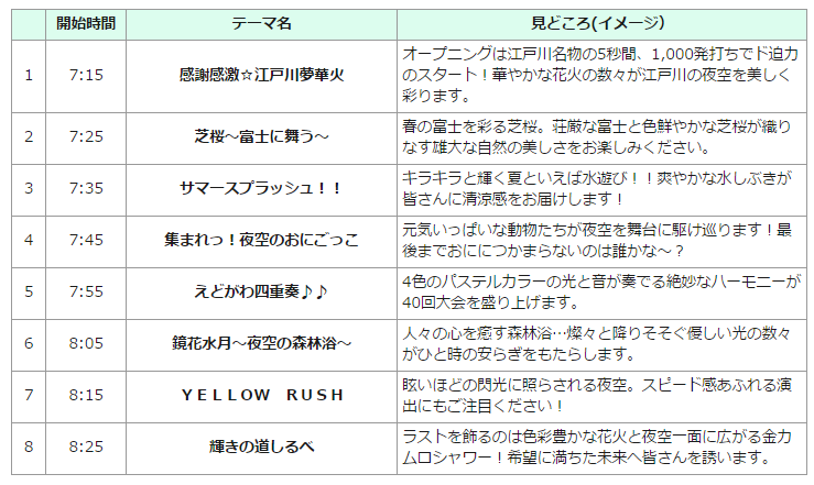 その他この江戸川花火大会は、だいたい10分ごとにテーマの異なる花火が打ち上げられ、どの時間帯も見逃せないでしょう。